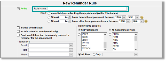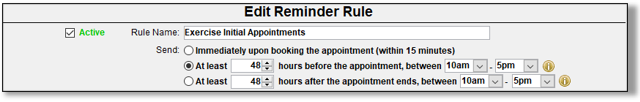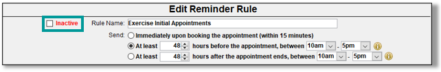To deactivate an automated appointment reminder rule, uncheck the ‘Active’ check box, it will change to red and ‘Inactive’.