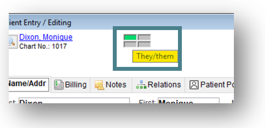The client dashboard, if activated, will not only show the patient’s name and chart number, but the expanded notes indicators, shown in the highlighted box below.
