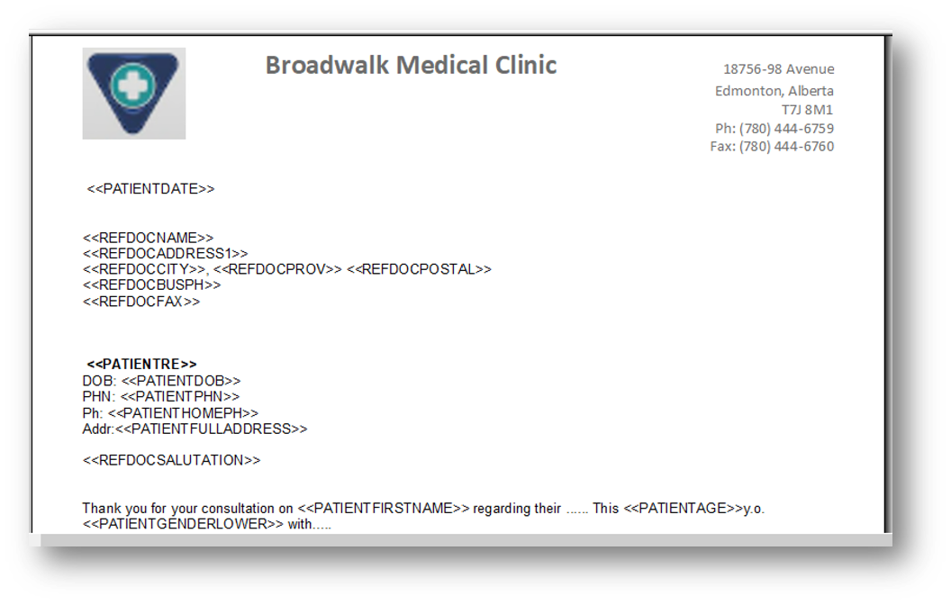 The text in the angle brackets in capital letters are the form fields that will pull into the letter based on the patient the template is for.