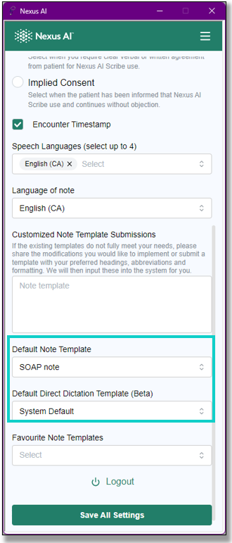 Tip* To save scrolling to find the same template all the time, set up the default template to be preselected for each new encounter. Click on settings, then at the bottom select the template from the dropdown and click save all settings.