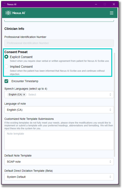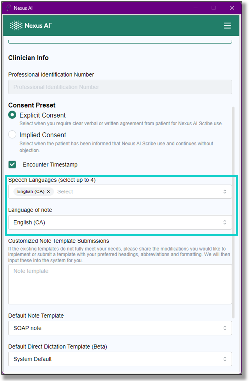 There is also a selection for the language of the note, this is what the scribe will generate in that can be copied over to the chart note for official documentation.