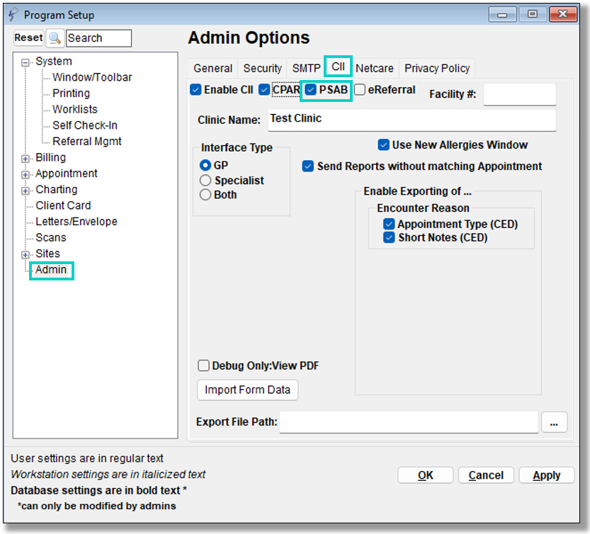 To manually enable Patient Summary your clinic must be live on CII/CPAR. The first step to activating Patient Summary is to have a clinic administrator go into Setup -> Program Setup -> Admin -> CII and select the PSAB check box.