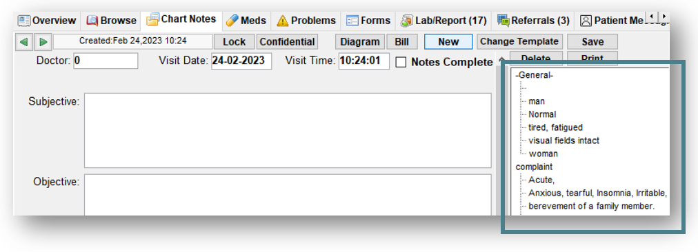 Chart notes are the templates used to make notes on encounters between practitioner and patient. There are many different templates available, containing multiple different field types. The below example has text boxes, numerical fields, and check ...