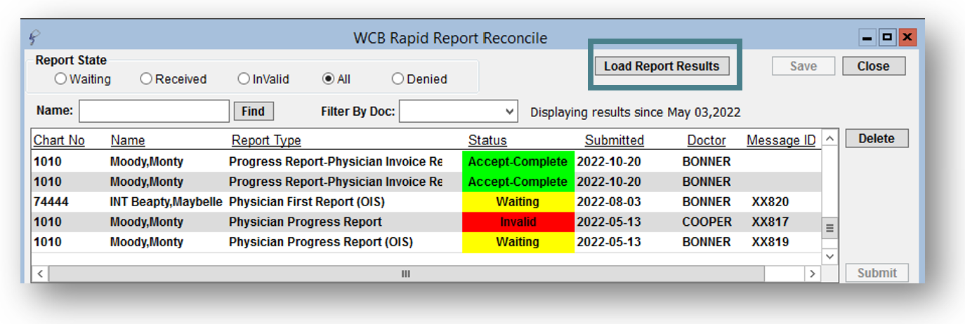 The reconcile window will default to display reports in the ‘waiting’ status; these are any reports that have been submitted but results have not yet been received.