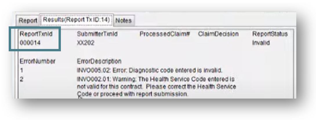The Results tab shows details of the error that caused the report to be invalid. Other information regarding the submission also appears in this window, including the report transaction identification ‘ReportTxnID’ number, which may be required if contacting WCB for assistance.