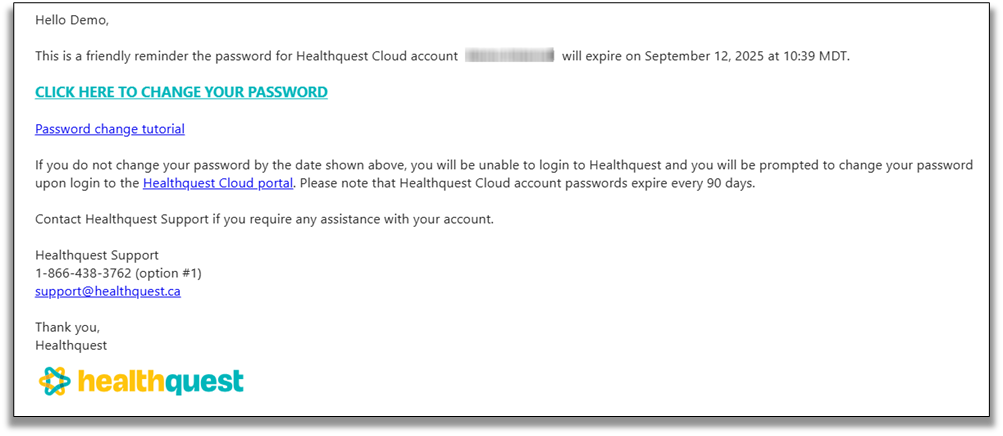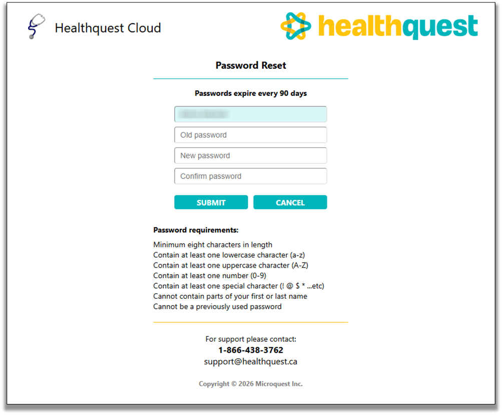 If your password expires or you forget your password to log into healthquest cloud, please call Healthquest support to help you reset your password 780-438-3762 (toll free 1-866-438-3762).