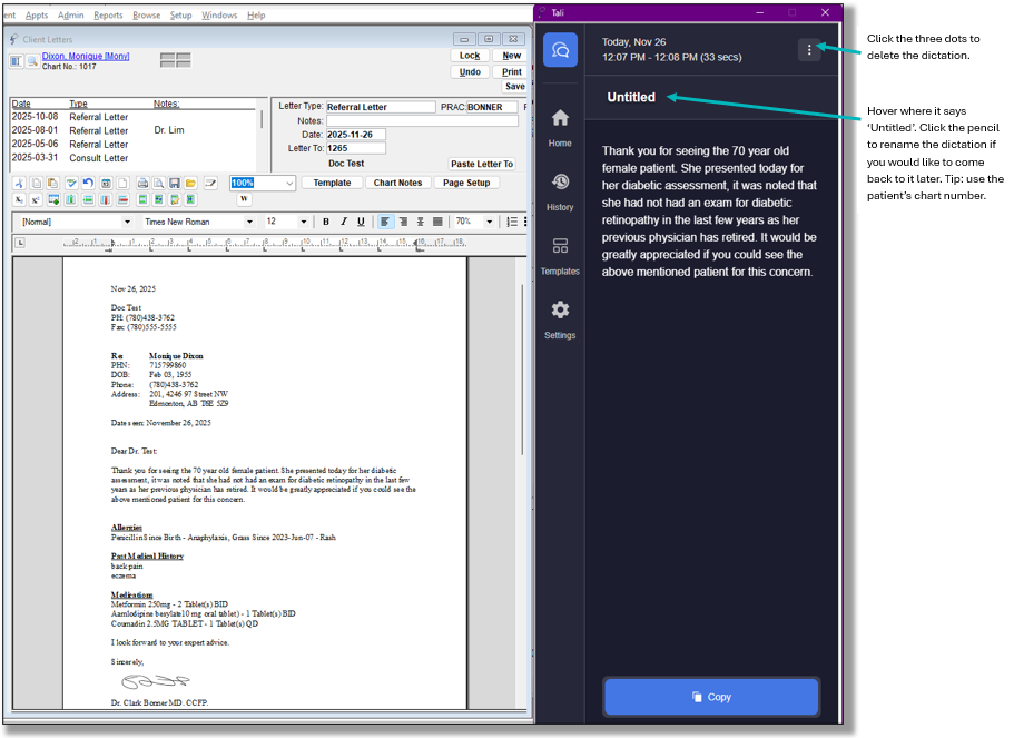 Included in Healthquest's Tali integration is a dictation feature that can be used to record information which can be copied and pasted into many areas of the EMR. This can be used to decrease the amount of time required for writing consult or referral letters, as well as in worklists, forms and charting.