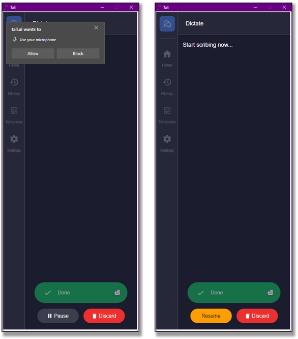 In your Tali window, select the 'Start a Dictation' button. Once you allow microphone access, you are immediately able to start recording your required information.