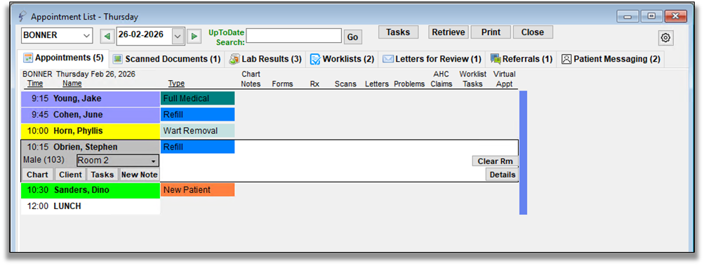 This doctor view (appointment list) is the navigation center for a practitioner to work through their day, accessing everyone who is booked with them, and everything assigned to them for review/action.