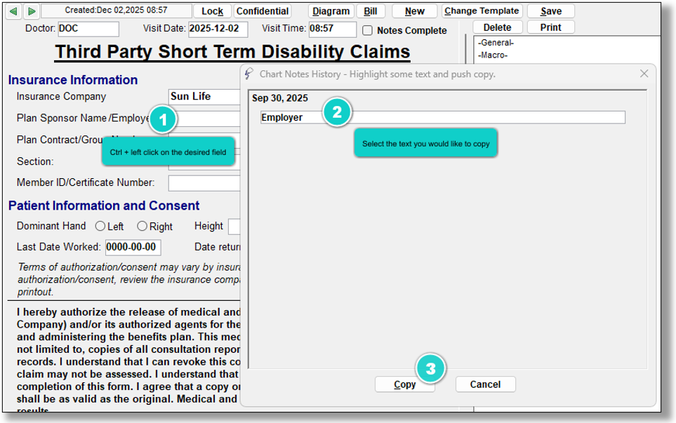 Ctrl + Left Click on a field that you would like to view the history of, or that you would like to copy the values into your new chart note.