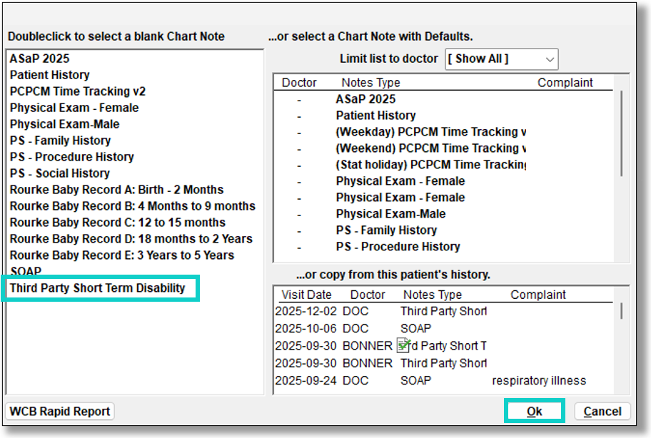 To create a follow up visit, create a new chart note and select a blank copy of the Third Party Short Term Disability template.
