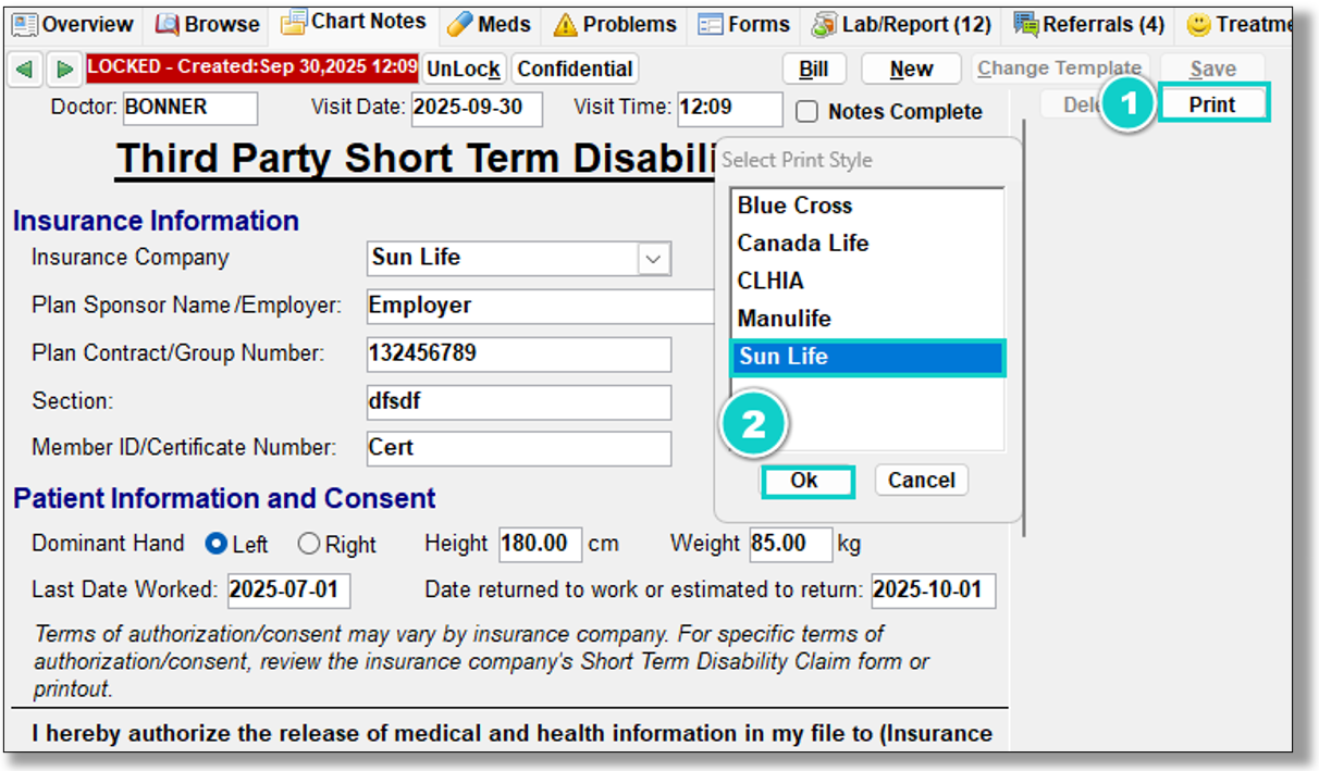 The charting template contains all the necessary fields to complete a short term disability form for 5 of the major insurance providers in the province of Alberta. Complete your documentation and print the form using a custom print design for the specified insurance company.