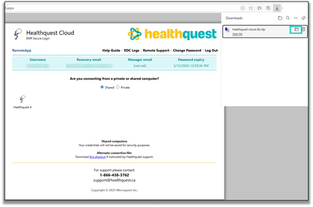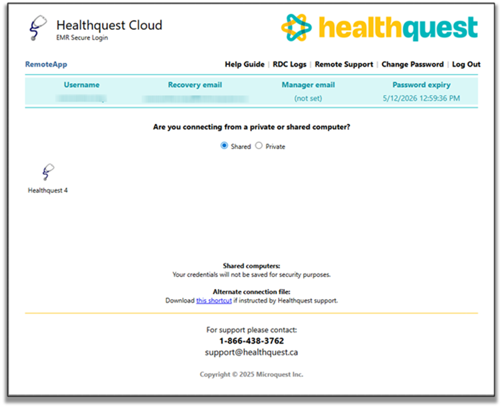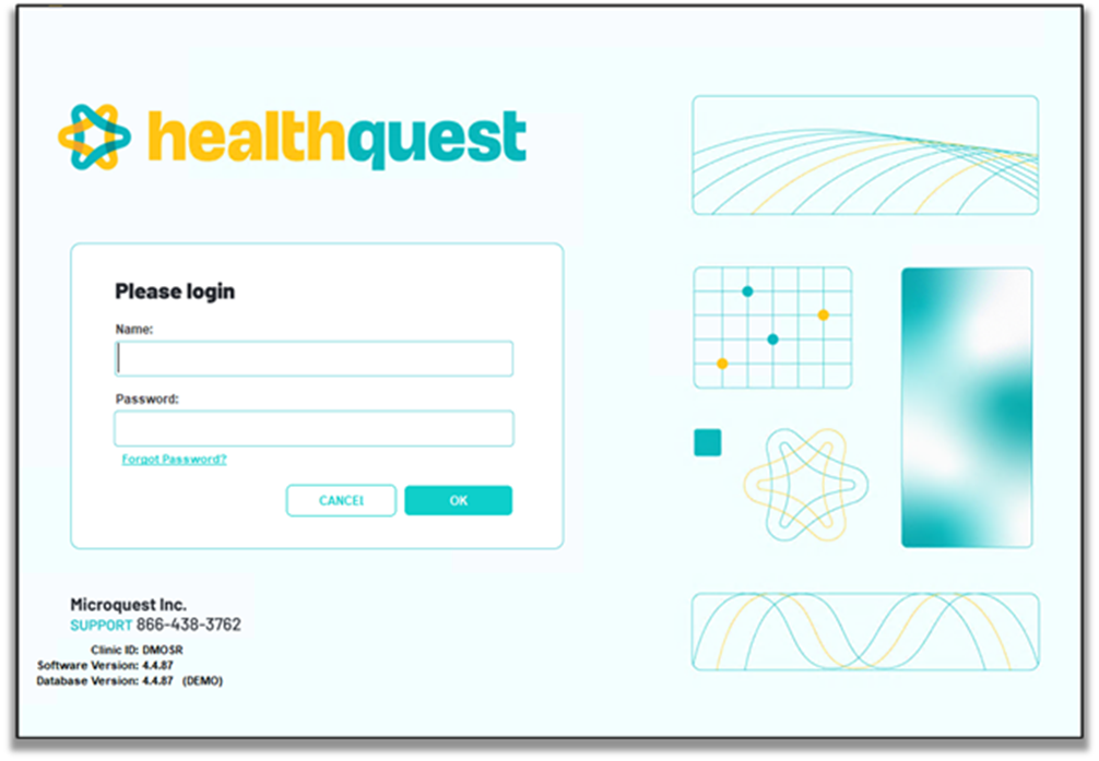 If prompted to login to Healthquest itself, please contact Microquest tech support toll free at 1-866-438-3762. (Local 780-438-3762).