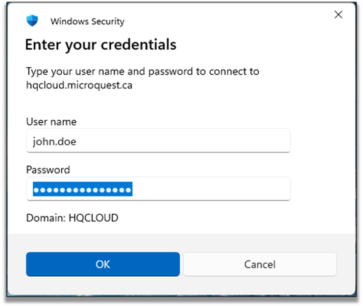 - If the Domain is blank, enter hqcloud\ in front if your username.